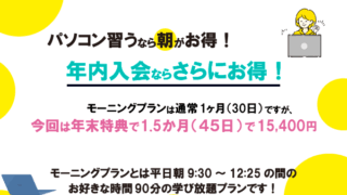 当校人気の「モーニングプラン」平日朝9時30分から12時25分迄の間のお好きな90分を予約なしで通える「学び放題プラン」今回は年末特別入会プラン通常期間1ヶ月のところ年内入会の方に限り1.5か月(45日)で15,400円Word、Excel...
